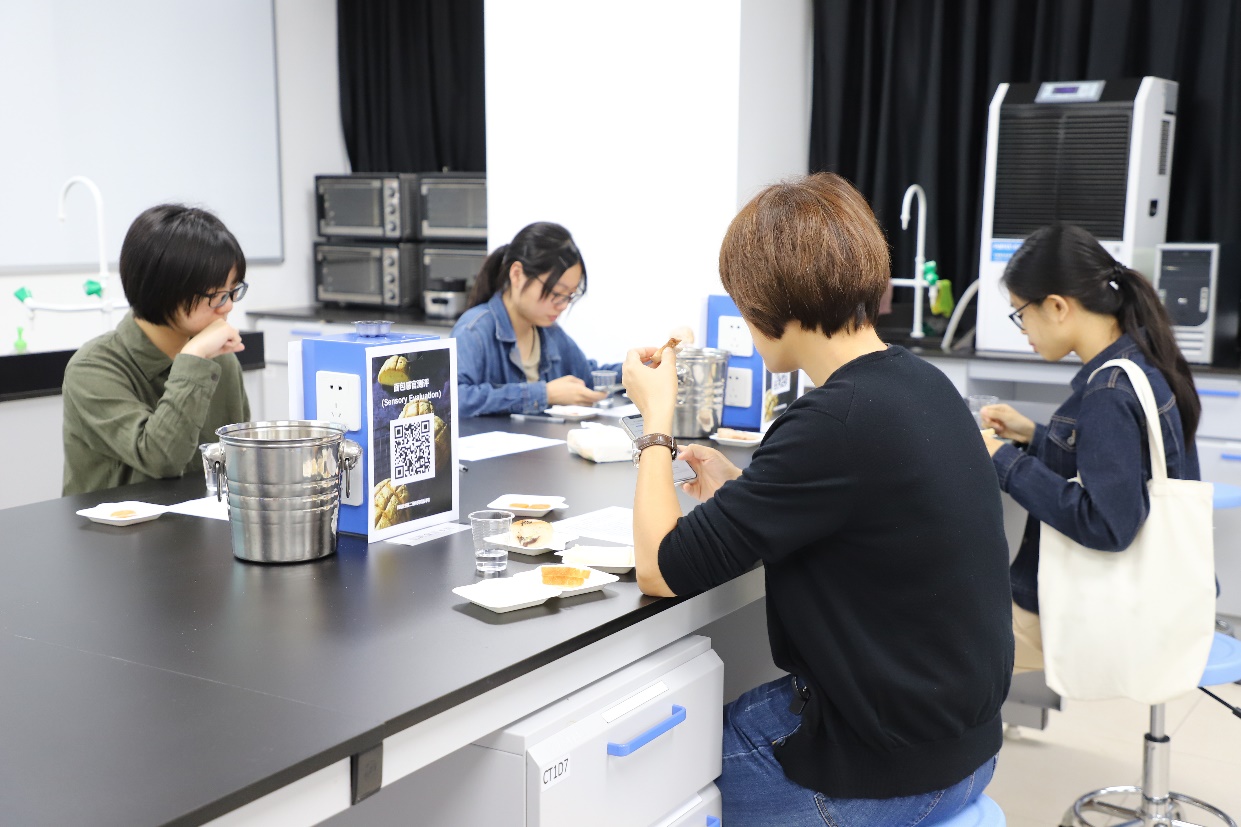 参与者在食品加工实验室(T8-501)认真品鉴样品