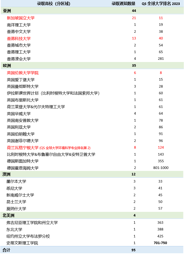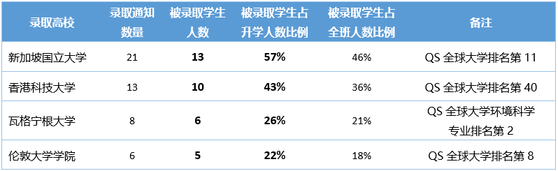其中有四个顶级名校的录取人次最多,分别是:新加坡国立大学21个、香港科技大学13个 (QS全球大学排名40)、瓦格宁根大学8个、伦敦大学学院6个,相应的被录取学生数分别占升学人数的57%、43%、26%和22%。最为突出的是新加坡国立大学,57%的录取率创造了新的记录,也就是说,过半的环科申研学生被录取。