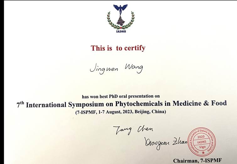 生命科学系博士研究生王静雯荣获第七届医药与食品中的植物化学物质国际会议(7-ISPMF)博士生论坛最佳报告奖