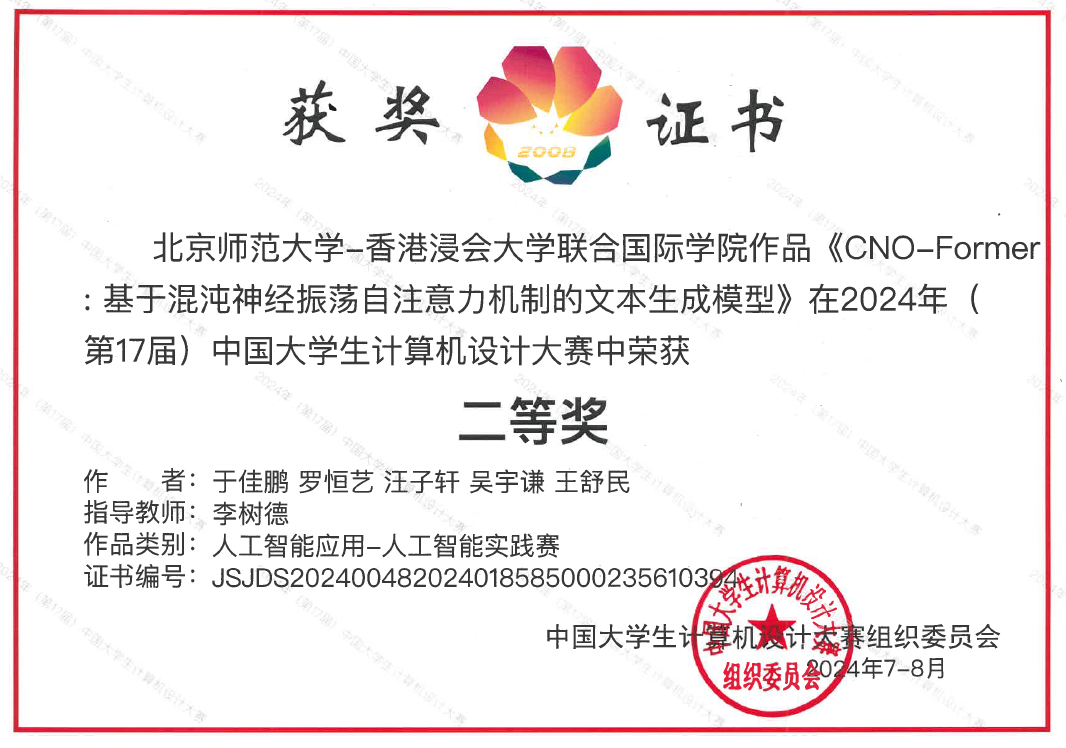 近日,2024年(第17届)中国大学生计算机设计大赛获奖名单公布,UIC理工科技学院梁敬毅、富一航、李越、蔡昕璐团队的作品《固定视角短视频的动态重建与障碍物去除》和于佳鹏、罗恒艺、汪子轩、吴宇谦、王舒民团队的作品《CNO-Former:基于混沌神经振荡自注意力机制的文本生成模型》荣获大赛国赛二等奖。