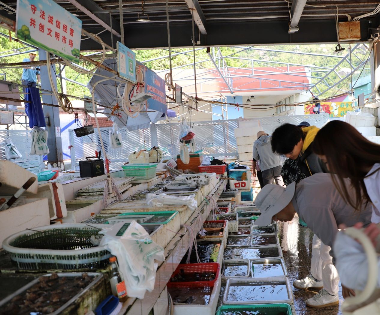 师生们科学考察的第二站是外伶仃岛的海鲜市场。与传统旅游观光不同,这次考察采用了系统的科学方法探索海产品产业链各环节。徐宝军教授带领学生们观察各类海产品,并引导他们思考从捕捞到销售的整个产业链中可能存在的问题。在考察过程中,师生们详细记录了各种问题,并与当地渔民和商家进行了深入交流,了解他们的需求和困难。按照事先制定的任务清单,学生们分为8个小组开展工作。在海鲜市场,学生们统计了各种海产品的包装材料使用情况,发现大量使用泡沫箱和塑料袋不仅带来食品安全隐患并加重环境负担,也限制了产品的保质期和销售半径。一位海鲜摊主向学生们介绍说:“我们的海产品品质好,但保鲜和运输一直是难题。如果能有更好的保鲜技术和包装,销路肯定会更广。”这些一线信息为学生们提供了宝贵的实践素材,也激发了他们思考如何将专业知识转化为解决实际问题的方案。