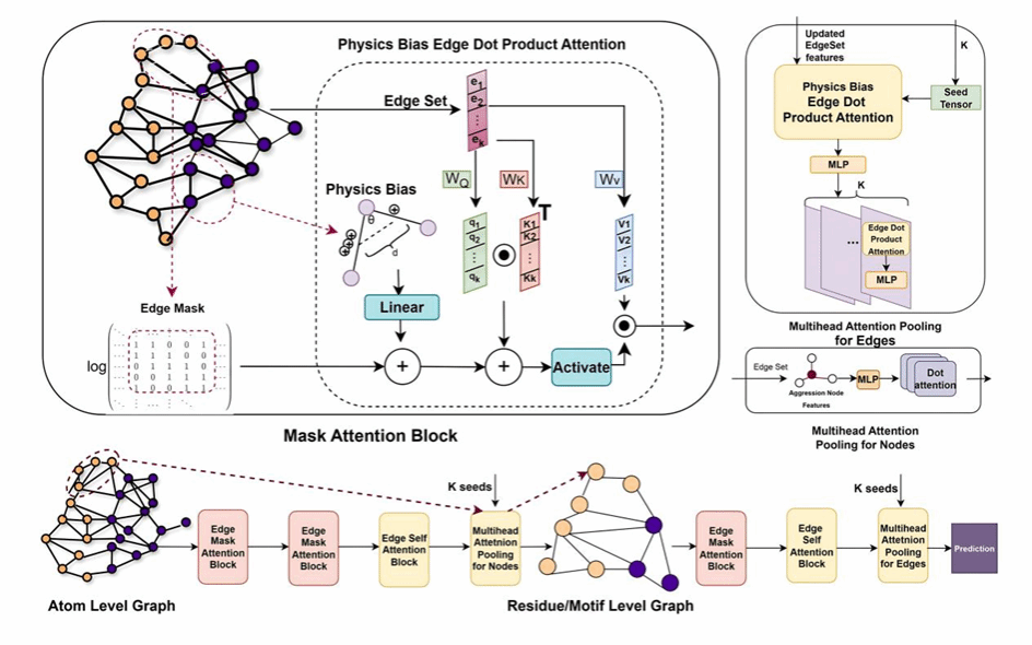 在药物研发中,科学家需要弄清楚“药分子”和“靶标蛋白”之间能否紧密结合、结合得多牢。这件事就像要预测两个人的握手是否稳固——其中的力来自各种看不见的“化学握力”,例如氢键、疏水作用和电性吸引。过去的图神经网络模型多是从单个原子的角度去理解这些复杂关系,但这有点像聚焦人的手指而非握手的过程。而本研究提出的新方法 PHESA(Physics-informed Hierarchical Edge-Set Attention,物理信息驱动的多层级边集合注意力 ) 选择了另一条路——让AI直接学习“分子之间的互动”本身,也就是这些“化学握力”的网络。
