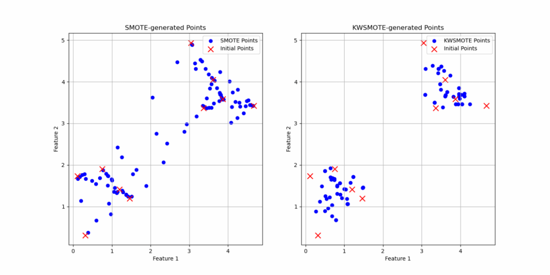 论文所提出的KWSMOTE生成点与传统方法对比示意图