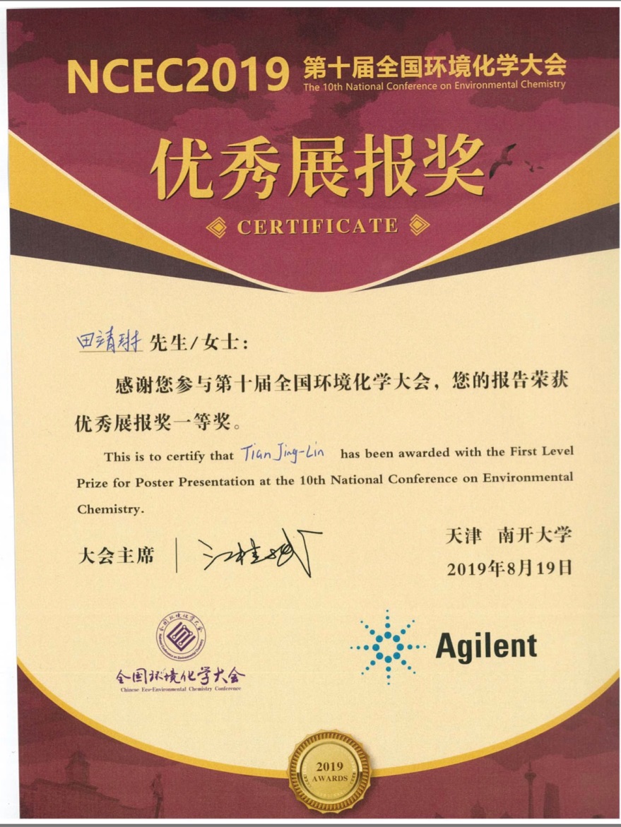 第十届中国环境化学大会于2019年8月15日至19日在天津南开大学召开。大会以“聚力污染防治攻坚战、引领环境科学新时代”为主题,吸引了7000余位环境化学领域专家学者和研究生参加。我校食品科学专业在读博士研究生田靖琳获得研究生优秀展报奖一等奖。