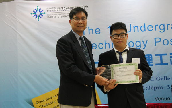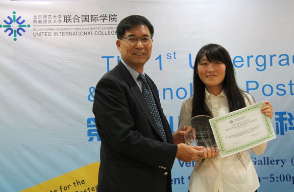 理工科技学部院长钟森文教授和教务长张根发为得奖同学颁奖,并对他们的海报略作点评。