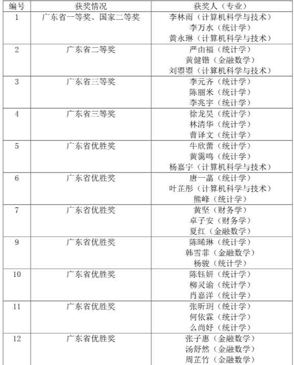其中,黄永琳(计算机科学与技术专业)、李林雨(计算机科学与技术专业)以及李万水(统计专业)同学所组成的小组,同时荣获美赛国际一等奖、国赛广东省一等奖及国家二等奖。