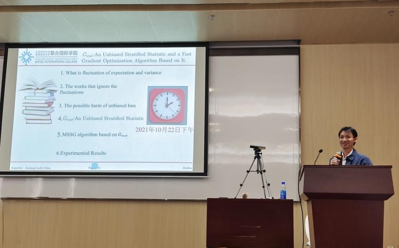 2021年10月22日,应UIC理工科技学部及统计与计算智能研究所的邀请,广东财经大学陈蔼祥教授为UIC师生带来了主题为“无偏分层统计量及其快速梯度优化算法”的讲座。陈教授介绍了一个新的无偏分层统计量