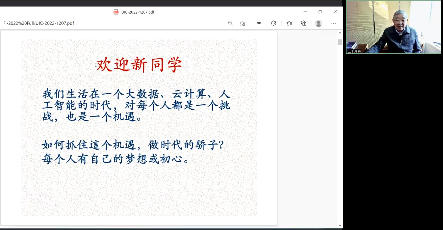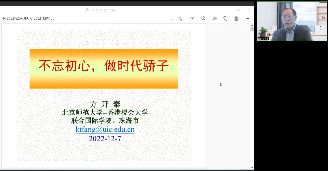 新架构下,统计与数据科学系融合了统计学与数据科学两大专业学科。11月中旬,随着73名大一学生通过专业分流选择进入数据科学专业,2022级统计与数据科学系全体新生也最终集结完毕。为了欢迎各位新生的到来并介绍与指引接下来四年的学习与生活,12月7日,统计与数据科学系邀请到统计学专业创始课程主任、著名统计学家方开泰教授给全体大一新生带来“不忘初心,做时代骄子”的线上主题讲座。