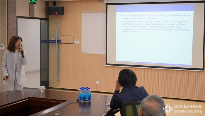 Dr Wang’s talk was titled ‘Security Selection Based on High Frequency Sharpe Ratio’. She explained that in portfolio allocation, the classical Mean-Variance model in Markowitz (1952) relies heavily on the covariance structure among assets. As the number and types of assets increase rapidly, traditional methods to estimate the covariance matrix and its inverse suffer from the common issues in high-dimensional analysis.