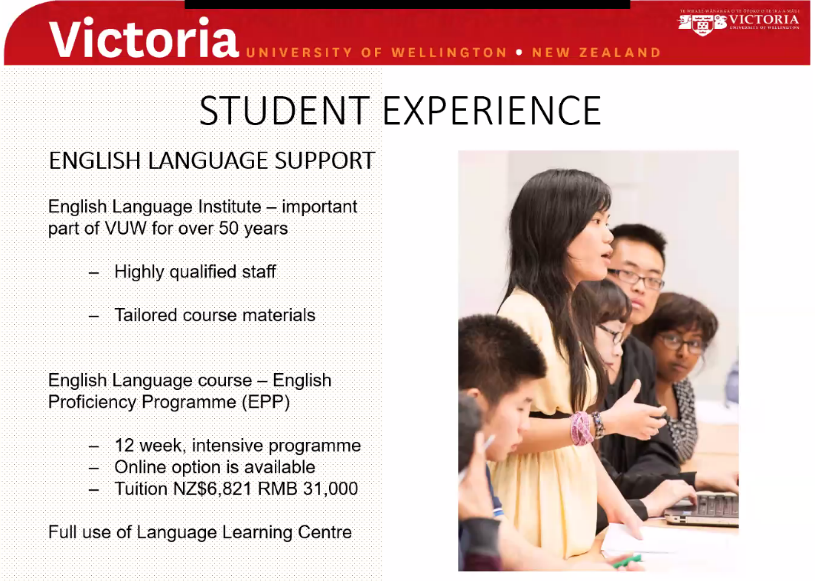 新西兰惠灵顿维多利亚大学为学生提供各种支持。如果学生没有达到英语入学要求,可以参加英语培训课程,通过考核后即可申请本校硕士课程。