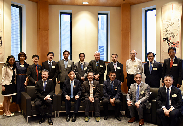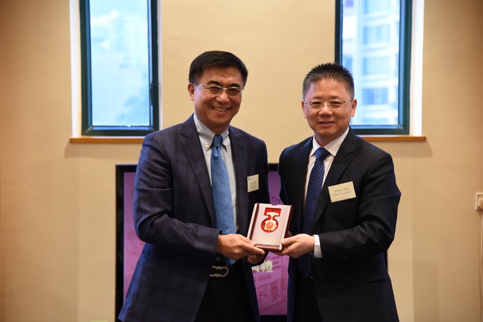 中央人民政府驻香港联络办公室教育科技部副部长蒋建湘向汤涛校长颁发纪念章