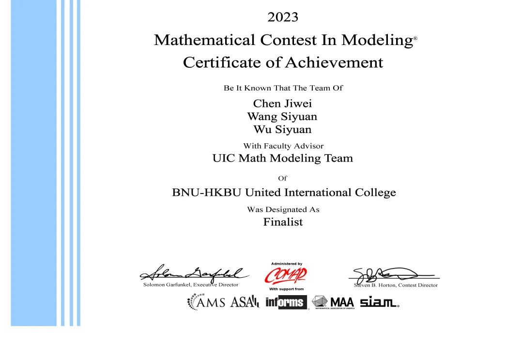 近日,2023年美国大学生数学建模竞赛结果揭晓。北师港浸大(UIC)学子再创佳绩,共有20组同学获奖,包括3组特等奖提名、4组一等奖和13组二等奖,特等奖提名数量创历史新高。