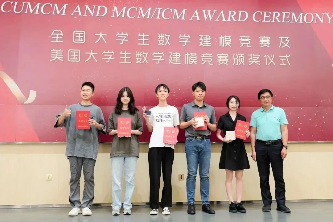 潘建新教授(右一)为美赛一等奖获奖同学颁奖
