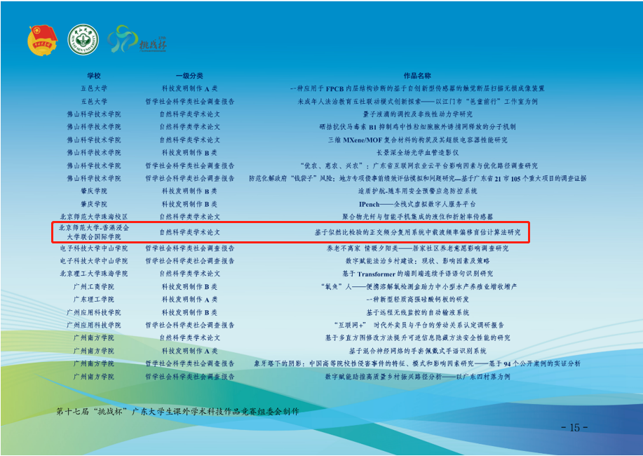 近日,第十七届“挑战杯”广东大学生课外学术科技作品竞赛终审决赛评审结果公示,我校统计与数据科学系统计学专业杜新炜老师团队的作品“基于似然比检验的正交频分复用系统中载波频率偏移忙估计算法研究”拟被授予自然科学类学术论文一等奖,这也是统计学专业学生在“挑战杯”赛事中获得的历史最好成绩。