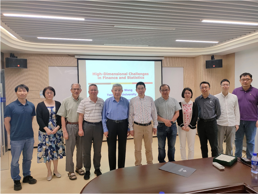 最后,统计与数据科学系讲座教授方开泰教授向王教授赠送纪念品,参会老师与王教授一起合影留念。会后,王教授和王偲橈、李易楠两位博士生进行座谈,对他们的学术发展给出了指导建议。