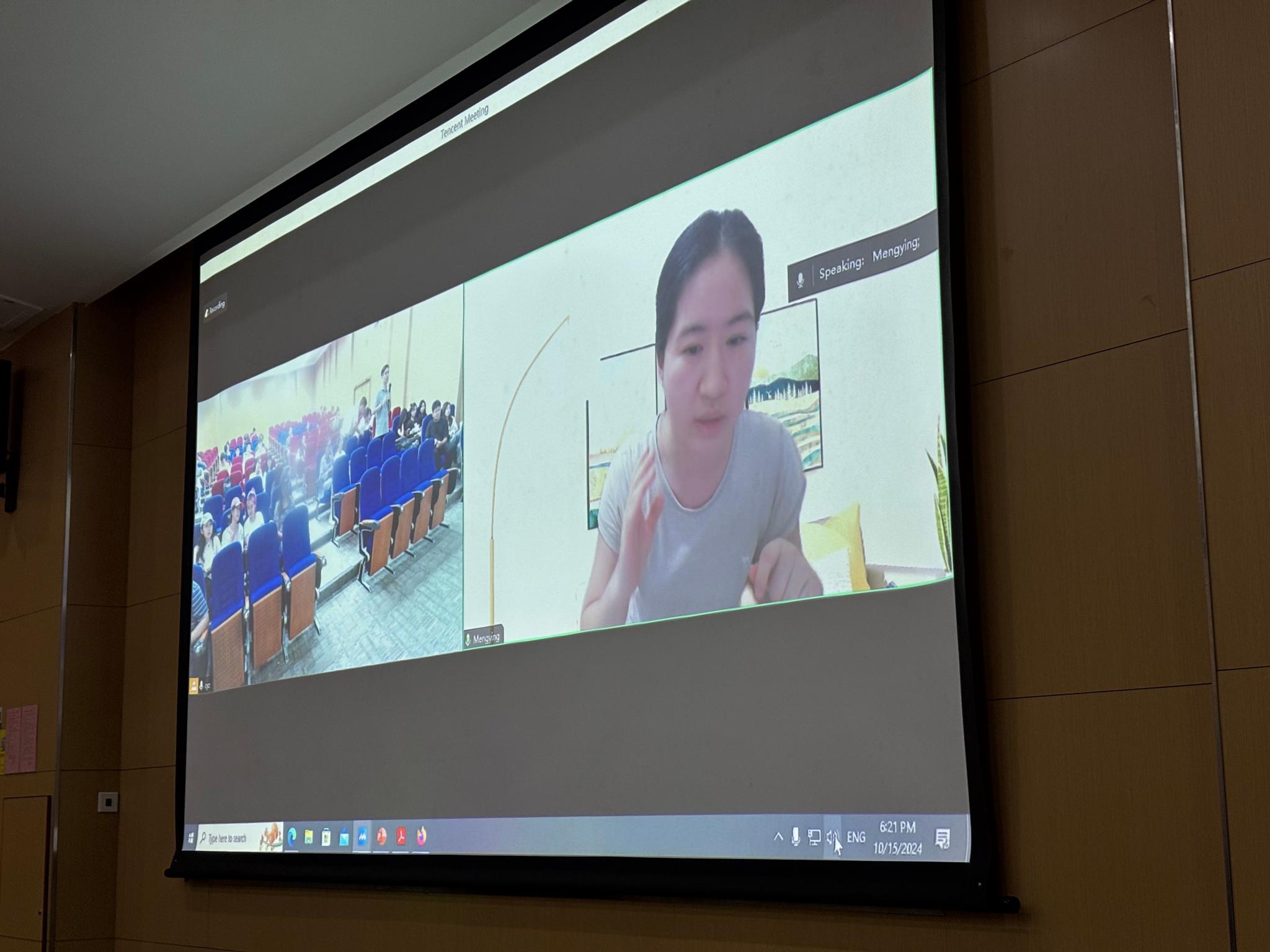 随后,两位分享嘉宾分别介绍了博士申请的相关心得和读博的感悟。第一位分享者陈梦影毕业于香港城市大学商业与数据分析授课型硕士课程,曾担任UIC理工科技学院统计学专业助教,后加入香港城市大学担任研究助理,现为香港城市大学神经科学系在读博士生。她在线上分享了自己在授课型硕士毕业后三年多的申博准备经历和跨专业学习的心得,并谈到了面对未来研究工作挑战所需的心理准备。她的经历激发了在场同学们对交叉学科研究的兴趣,增强了他们参与科研的信心。