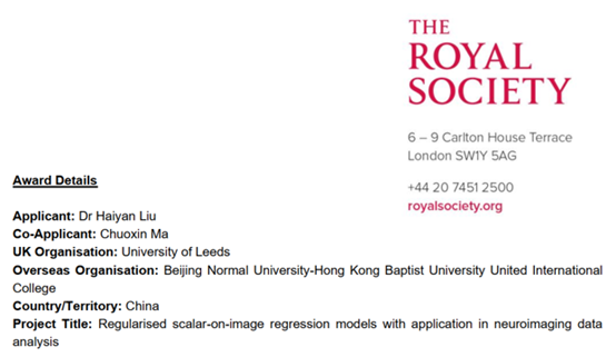 近日,由利兹大学数学学院刘海燕博士与UIC理工科技学院马绰欣博士共同申请的合作交流项目“Regularised scalar-on-image regression models with application in neuroimaging data analysis(正则化图像回归模型在神经影像学数据分析中的应用)”成功获得英国皇家学会的立项批准。该项目属于英国皇家学会中英国际合作交流项目,是英国皇家学会为促进中英科学家国际学术交流而设立的资助项目。